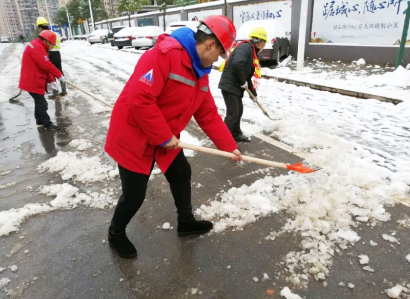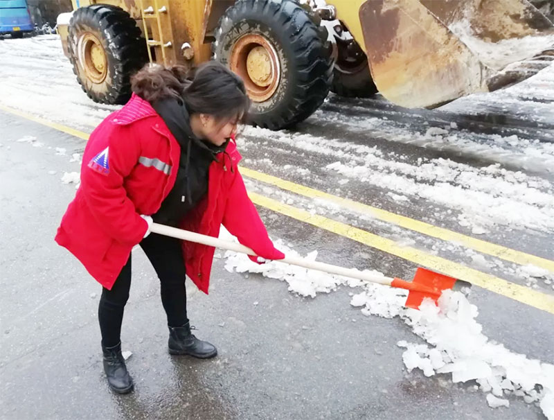 有想法就付諸于行動(dòng),簡短交流后,員工們開始有效的分工安排,開裝載機(jī)、拿鐵鍬、用掃帚、撒工業(yè)鹽、保障物資等,默契合作。