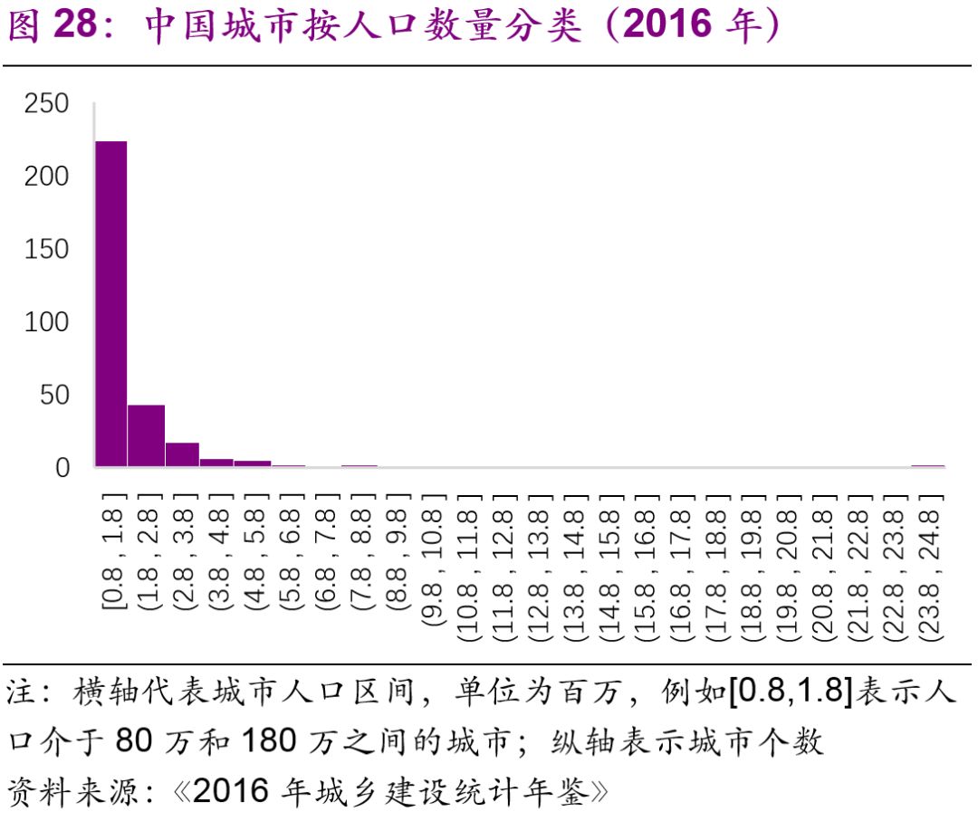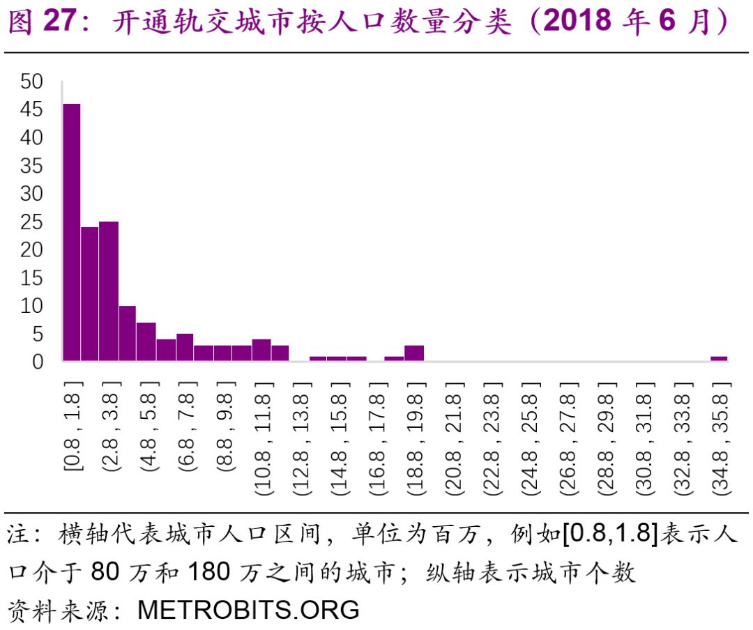 擬建地鐵、輕軌線路初期客運強度分別不低于每日每公里0.7萬人次、0.4萬人次,遠期客流規(guī)模分別達到單向高峰小時3萬人次以上、1萬人次以上。但是同時也強調(diào)了:“以上申報條件將根據(jù)經(jīng)濟社會發(fā)展情況按程序適時調(diào)整?!?016年,中國城市中市區(qū)常住人口在150萬以上的城市共有111個,對比目前已經(jīng)開通軌道交通的城市數(shù)量(34個),仍有一定的發(fā)展空間。而從國際上看,建設(shè)軌道交通的城市人口的起點[19]大約為100萬(圖27),如果長期內(nèi)中國將建設(shè)軌道交通的人口標(biāo)準(zhǔn)下調(diào)至100萬,那么將有225個城市符合標(biāo)準(zhǔn)(圖28)。