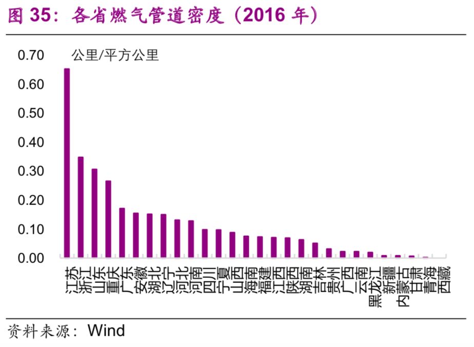 管道長度遠低于美國等國家。2016年,中國的管道長度為12.6萬公里,大幅低于美國(222.5萬公里,2013年數(shù)據(jù))、俄羅斯(26.0萬公里,2007年水平)(圖20)。從密度和人均水平上來看,2016年中國管道密度為0.013公里/平方公里,與日本(0.013公里/平方公里)、俄羅斯(0.016公里/平方公里)相當(dāng),但遠低于美國(0.24公里/平方公里)、英國(0.16公里/平方公里)等西方發(fā)達國家(圖9);