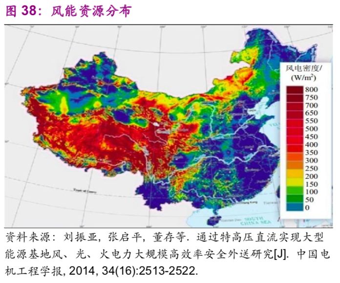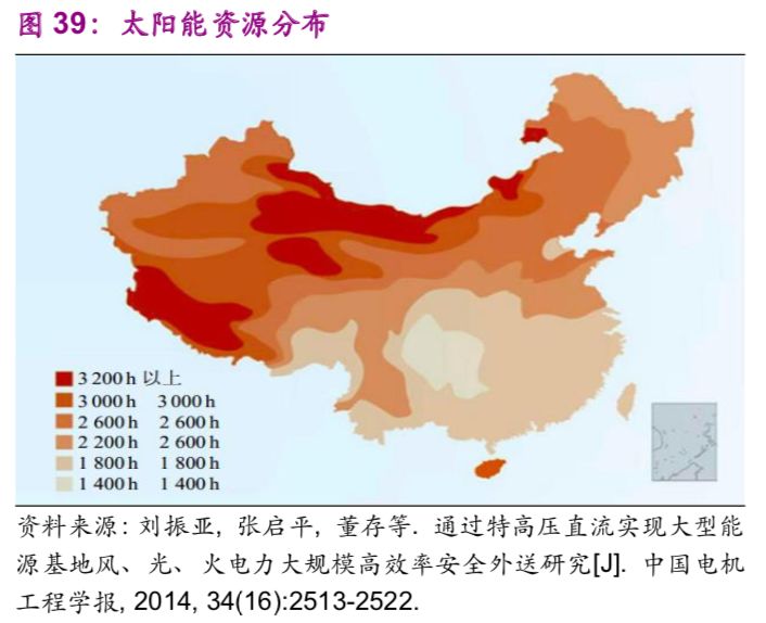 中國能源資源在地區(qū)之間的不平衡分布帶來了跨地區(qū)之間的能源輸送需求,例如“西電東送”“西氣東輸”。以水力資源為例,中國西部12個省的水力資源約占全國總量的81.46%,特別是西南地區(qū)的云、貴、川、渝、藏5個省占全國總量的66.70%。風(fēng)能、太陽能同樣呈現(xiàn)西部多于東部的現(xiàn)象(圖38、39)。