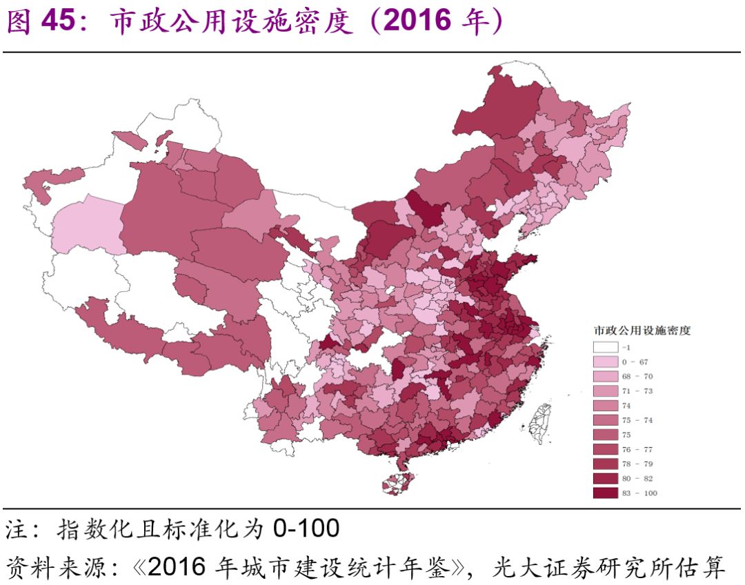 城市市政公用設(shè)施投資結(jié)構(gòu)不斷變化。隨著中國城鎮(zhèn)化的不斷推進,2016年投資額達1.7萬億元的城市市政公用設(shè)施投資結(jié)構(gòu)有了較大變化:1990年占據(jù)較大比重的燃氣(16%)、供水(20%)隨著滲透率觸及“天花板[26]”后比重下降較快,兩者2016年的比重分別為2%、3%;而更能體現(xiàn)城市功能升級的公共交通、道路橋梁等的比重上升較快,1990年兩者的比重分別為8%、26%,2016年則分別為23%、43%;此外,許多新型的城市市政公用設(shè)施投資開始出現(xiàn),例如地下綜合管廊,2016年占比達到了1.7%(圖44)。
