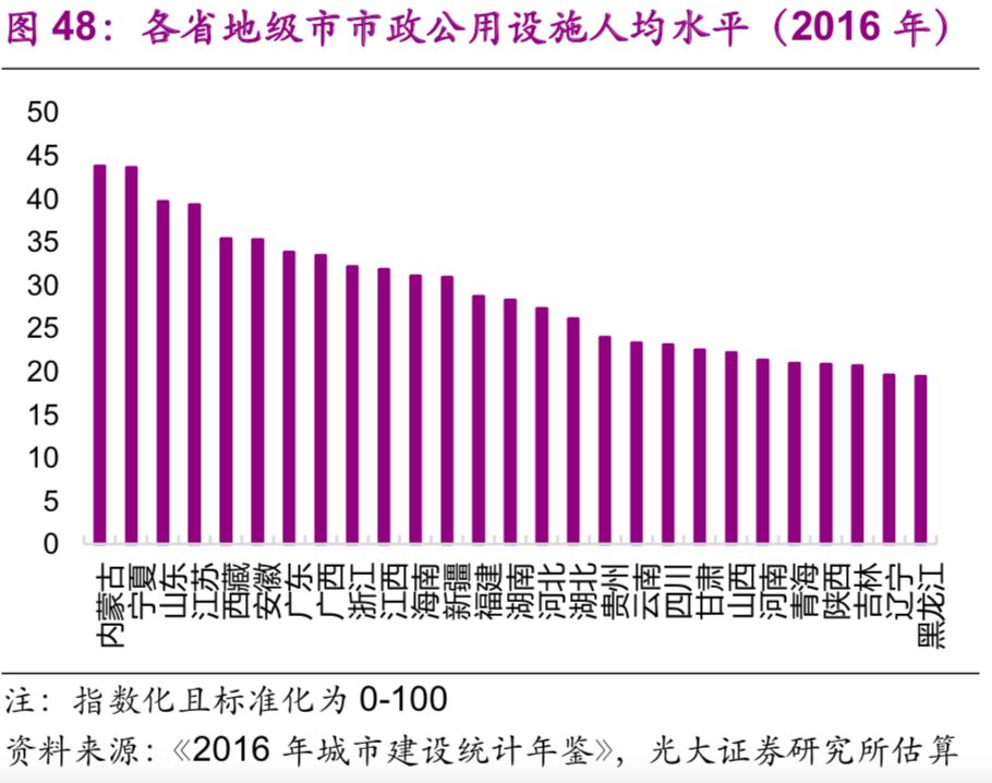 歷史上城市市政公用設(shè)施投資增速與總體基礎(chǔ)設(shè)施建設(shè)投資增速相關(guān)性較高,但近年來分化加大。而2014年開始實行的規(guī)范地方政府債務(wù)的一系列舉措使得當(dāng)年的城市市政公用設(shè)施投資增速轉(zhuǎn)負,2014、2015年的增速分別為-0.63%、-0.25%,直到2016年才轉(zhuǎn)正。而城市市政公用設(shè)施投資占總體基礎(chǔ)設(shè)施建設(shè)投資的比例則不斷下降,2016年僅為11.5%,較2003年的高點(32.6%)下降了21個百分點(圖43)。